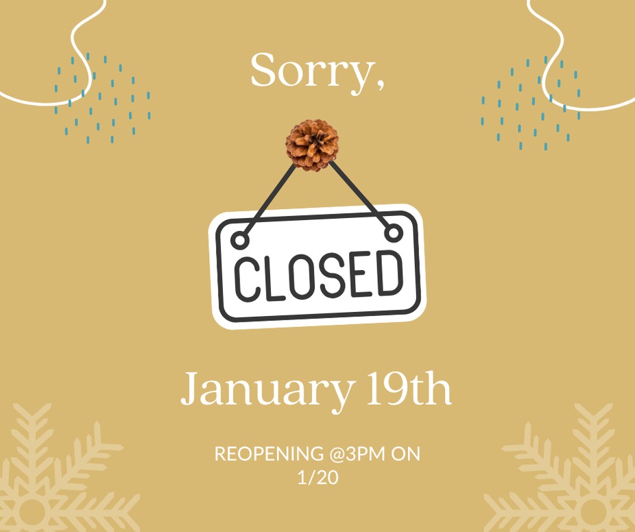 We will be closed on January 19th to have a holiday party with our staff. We will reopen on 1/20 @ 3pm!