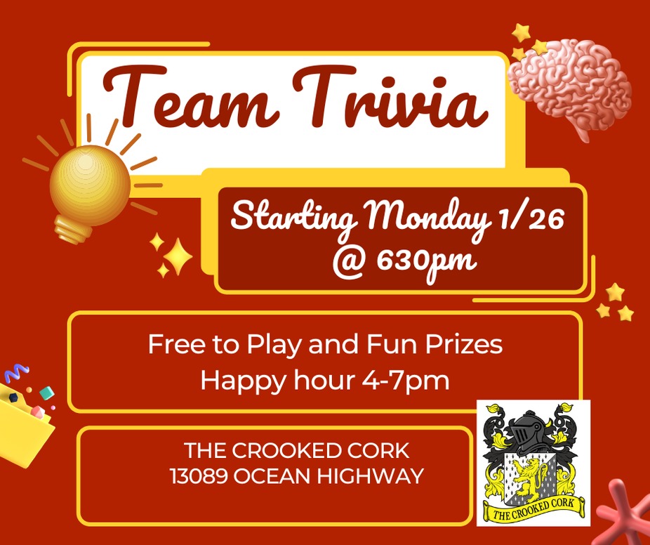 Grab your friends and come test your knowledge! Team trivia from 4:30 to 6:30PM on Monday Nights.